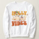 Retro groovy typography customisable script sweatshirt. The design features the text "Holly Jolly Vibes" in yellow, beige and brown groovy typography with boho-themed floral and party-based elements. The name can be easily customised. Makes for the best personalised gift for yourself, your friends, family members and even neighbours. We have 45+ more Christmas designs in retro, watercolor and funny typography-based themes in our collection that you will definitely love. Merry Christmas!