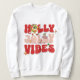 Retro groovy typography customisable script sweatshirt. The design features the text "Holly Jolly Vibes" in pink and red groovy typography with boho-themed floral and party-based elements. The name can be easily customised. Makes for the best personalised gift for yourself, your friends, family members and even neighbours. We have 45+ more Christmas designs in retro, watercolor and funny typography-based themes in our collection that you will definitely love. Merry Christmas!