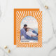 This Save the Date card features a vibrant colour scheme of orange and white with groovy sunrays that will transport you to the 70's. Its distinctive arch-shaped design and photo on the front is accompanied by your custom text in a retro font. On the back of the invite, you'll find a QR code to scan to access the wedding website for additional information.