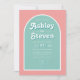 This photo wedding invitation is inspired by the 70s, showcasing retro groovy pink-peach and pearl aqua hues. It embodies a retro style with a touch of seventies vibes, presented in soft pastel colours. The front of the invitation displays an arch design along with your personalised text, while the back features a retro flower pattern and a photo of the couple.