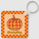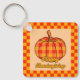 Retro groovy style colourful red and orange chequered keychain. Elegant retro font typography "Happy Thanksgiving", with a cute plaid pumpkin and red and orange chequered frame.
