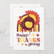 A colourful greeting card with elegant typography "thanksgiving" text, and a cute turkey with some autumn leaves. The card includes a wonderful greeting message at the back which can be personalised.