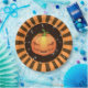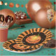 Retro style Halloween plates with black and orange rays and a jack o'lantern.