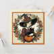 This Halloween greeting card has a retro  vibe and features a pretty witch in a big witch hat, a black cat and a pumpkin.  She's surrounded by a wreath of branches and leaves in pretty fall colours. It's lovely Halloween card to use as an invitation, to give with a gift or to use as a Halloween spooky season!