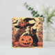 Here's a retro looking Halloween card that features a pretty witch in a pointy witch hat with a black cat amd a pumpkin. There is a in the background along with autumnal leaves. The card has a distinctly 60s or 70s vibe. It's a cool card to use as an invitation, as a greeting card or as a card to give with a gift. This card will be appreciated by anyone who likes spooky stuff, retro and vintage art and illustrations and witches.