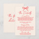 Simple and stylish retro colorful wedding guest info details. With creamy milky background and red bright hand written text layout with whimsical wordings and vintage hand drawn bow . All the info are customizable as website, transportation, accommodation . Grab it along with other products from this classy hand made retro wedding suite.