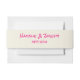 A very elegant and unique hand written whimsical wedding belly band. That matches the whole wedding hand written suite theme vibe. It has bright vivid pink hand written script with colourful cream milky background. With hand written names and date above it.