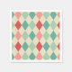 Enjoy a fun retro look reminiscent of the circus with this harlequin design in shades of teal, mint, red, pink and beige. Shown here with simply the harlequin pattern, this napkin is also available in a personalised version for birthday parties and other events.