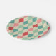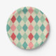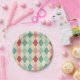 Enjoy a fun retro look reminiscent of the circus with party plates in a vintage harlequin design with shades of teal, mint, red, pink and beige. Shown here with only the harlequin pattern, a personalised birthday party version of this design is also available. Matching napkins are available in this design.