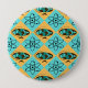 This Retro Harlequin Globe Trotter Round Button design features a repeating pattern of an abstract oval globe with wood grain continents and atomic symbols. The oceans on the vintage globe are in shades of teal and turquoise. The globe is on a triangular wooden stand and the whole world is on a wheat coloured background. The atomic symbols are on a turquoise background. This design is kitschy, space age goodness at its finest!