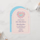 Celebrate your love with this vibrant retro-inspired arched wedding invitation, featuring a layered rainbow heart design in bold pink, blue, and yellow tones. The front sets a playful and joyful tone, while the back includes a custom QR code RSVP on a bright blue background for easy guest response. Perfect for couples planning a fun, colourful celebration or a 70s-style wedding with a modern twist. Fully editable and ideal for summer weddings with personality.