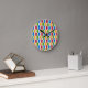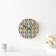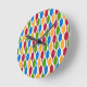 This clock has a mid-century modern design of retro hexagons in red, green, blue, and gold.