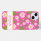 This iphone 15 plus phone case is so cute and girly! It's hippie 70s daisy floral pattern with multi-sized white and yellow daisies on a pink background and your name in a fun trendy font will go with everything! It will look fabulous on your phone!