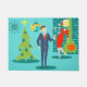 This Retro Holiday Cartoon Couple Door Mat will put you in the holiday spirit. The front design features a turquoise background with teal bricks and an olive green, cone fireplace. There is a teal, starburst wall clock and a two-tier pendant lamp in shades of yellow, blue and black. A green Christmas tree is adorned with a yellow star and teal ornaments. Front and centre, there is a distinguished, martini-swilling businessman in a blue suit and orange tie. To his side, his blonde bombshell of a trophy wife is wearing a red wiggle dress and a Santa hat while holding a tray of martinis. Fa-la-la-di-da!