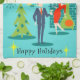 This Retro Holiday Cartoon Couple Kitchen Towel will put you in the holiday spirit. The design features a turquoise background with teal bricks and an olive green, cone fireplace. There is a teal, starburst wall clock and a two-tier pendant lamp in shades of yellow, blue and black. A green Christmas tree is adorned with a yellow star and teal ornaments. Front and centre, there is a distinguished, martini-swilling businessman in a blue suit and orange tie. To his side, his blonde bombshell of a trophy wife is wearing a red wiggle dress and a Santa hat while holding a tray of martinis. Beneath the picture, two vintage starbursts surround the words, "Happy Holidays." Fa-la-la-di-da!