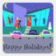 These customisable Retro Holiday Cartoon Party Christmas Stickers will put you in the holiday spirit. The design features the exterior of a mid century modern house. Through the floor to ceiling turquoise glass walls, we can see the navy blue silhouettes of festive party goers. There is a couple chatting in front of a green Christmas tree, which is decorated with teal ornaments. On the opposite side of the room, we can see a dancing man and the long-winded man everyone is trying to avoid. The exterior of the house features a cheery red door with a holiday wreath, an oversize purple brick fireplace, and strands of colourful Christmas lights. A grey walkway is cutting a swath to the front door, through the teal grass. The nighttime scene has a dark blue sky with a yellow, crescent moon. The plastic snowman decorating the front yard is being greeted by the first snow flurries of the season. An attractive couple is doing the cha-cha-cha on the way to their car. The blonde woman is wearing a bright red dress. She is holding a sprig of mistletoe in one hand. Her handsome escort is wearing a black suit and a red tie. His hands are wrapped around the woman's waist. On the street, in front of the house, we can see three, brightly coloured classic cars. The bottom of our version says, "Happy Holidays," but you can personalise them if you wish. Order today and party like it's 1959!