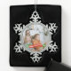 Retro Holiday Personalised Photo Ornament for your Christmas home decor. Upload photo, customise text Christmas greeting slogan and year on Christmas red and green banner graphic to create your own custom personalised snowflake pewter Christmas ornament with family photo, pet photo or image. Displayed is unique ornament with custom family photo picture frame.