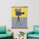 Wall tapestry features a retro Hollywood tripod style movie making camera on a modern yellow and grey colorblock background