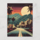 The image depicts a stylised illustration of a scenic Hollywood view. The colour palette is warm with a retro vibe, featuring shades of orange, red, yellow, and teal. In the foreground, there's a road that leads towards the horizon, marked with white lines that suggest motion blur, giving a sense of depth and movement.