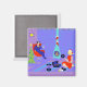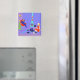 This Retro Home for the Holidays Christmas Magnet looks like a scene out of a 1960's television Christmas special. The minimalist design features an attractive cartoon couple in the living room of a mid century modern house. The room prominently features a purple and blue stone wall and a matching purple and blue striped rug. Against the wall, there is a turquoise cone shaped fireplace with a roaring fire. Two, red and white Christmas stockings have been hung by the mod chimney with care. Strands of colourful Christmas lights are strung across the top of the wall. In the corner, the suave man of the house is lounging in a red egg chair. He is wearing a blue suit with a red tie. There is a sprig of holly pinned to his lapel. In one hand, he is holding a martini glass. No wonder he's so full of the Christmas spirit! Beside him, there is a small, green Christmas tree with teal ornaments and a yellow star. Hanging from the ceiling, there is a yellow Sputnik light fixture. A blonde with an hourglass figure is sitting on the rug. She is wearing a festive, red dress and Santa hat. Beside her, on the floor, there is a blue and black portable record player. Several Christmas albums are scattered near the beautiful deejay. Go ahead and sing along. You know you want to!
