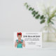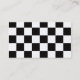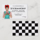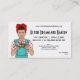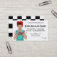 This retro inspired designs features a 1950's woman wearing a red and white polka dot dress with a teal apron. Her curly brown hair is wrapped in a matching red head wrap. She is holding a plate of yummy and colourful cupcakes. This versatile design has plenty of text and can be customised for any baking business. The flip side of this vintage card features a customisable black and white chequerboard pattern.