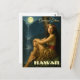 A retro style graphic of a native South Sea Island girl by a moonlit waterfall in a tropical paradise. You can personalize the text in this template.