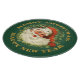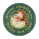 This is a fun portrait of Santa Claus with his traditional red and white stocking cap and bushy white beard. He wears a sprig of holly with a red berry. The portrait is surrounded by a wreath of pine needles on a green background. Half circle glittery gold text at the top says Merry Christmas, and at the bottom Happy New Year. *Please note - the image is printed and does not contain actual glitter.*