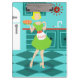 With this Retro Kitchen Clip Board, you can have your pie and eat it, too. This kitschy, minimalist art drawing features a perfect 1950's housewife, in her mid century modern kitchen. The beautiful baker is wearing a flouncy, green dress and a white apron with red detailing. Not a hair on her blonde head is out of place. In one hand, she is holding the fruit of her labour--a gorgeous, lattice topped, fruit pie. One glance and you'll know that her flaky pie crusts are second to none. She is standing on an aqua and teal chequerboard floor, which is undoubtedly clean enough to eat off of. Against an aqua wall, we see teal cabinetry with aqua trim work, a red countertop, red drawer pulls, and black starburst accents. A red, starburst clock is hanging on the wall. To the side, there is a state of the art, white refrigerator with silver handles. At least, the fridge was state of the art in 1950's. Now, it's just plain dreamy! Whether you're Suzie Homemaker or simply have an affinity for all things vintage, you're sure to love this scrumptious slice of Americana.