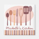 A collection of fun, retro styled cooking and eating utensil decorates this personalised kitchen magnet. In pretty shades of rose, mauve, pink and cocoa. More colour schemes available:
