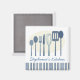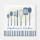 A collection of fun, retro styled cooking and eating utensil decorates this personalised kitchen magnet. In pretty shades of blues on a white background. More colour schemes available: