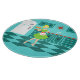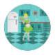 With this Retro Kitchen Cutting Board, you can have your pie and eat it, too. This kitschy, minimalist art drawing features a perfect 1950's housewife, in her mid century modern kitchen. The beautiful baker is wearing a flouncy, green dress and a white apron with red detailing. Not a hair on her blonde head is out of place. In one hand, she is holding the fruit of her labour--a gorgeous, lattice topped, fruit pie. One glance and you'll know that her flaky pie crusts are second to none. She is standing on an aqua and teal chequerboard floor, which is undoubtedly clean enough to eat off of. Against an aqua wall, we see teal cabinetry with aqua trim work, a red countertop, red drawer pulls, and black starburst accents. A red, starburst clock is hanging on the wall. To the side, there is a state of the art, white refrigerator with silver handles. At least, the fridge was state of the art in 1950's. Now, it's just plain dreamy! Whether you're Suzie Homemaker or simply have an affinity for all things vintage, you're sure to love this scrumptious slice of Americana.