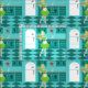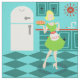 With this Retro Kitchen Fabric, you can have your pie and eat it, too. This kitschy, minimalist art drawing features a perfect 1950's housewife, in her mid century modern kitchen. The beautiful baker is wearing a flouncy, green dress and a white apron with red detailing. Not a hair on her blonde head is out of place. In one hand, she is holding the fruit of her labour--a gorgeous, lattice topped, fruit pie. One glance and you'll know that her flaky pie crusts are second to none. She is standing on an aqua and teal chequerboard floor, which is undoubtedly clean enough to eat off of. Against an aqua wall, we see teal cabinetry with aqua trim work, a red countertop, red drawer pulls, and black starburst accents. A red, starburst clock is hanging on the wall. To the side, there is a state of the art, white refrigerator with silver handles. At least, the fridge was state of the art in 1950's. Now, it's just plain dreamy! Whether you're Suzie Homemaker or simply have an affinity for all things vintage, you're sure to love this scrumptious slice of Americana.