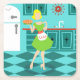With these Retro Kitchen Paper Coasters, you can have your pie and eat it, too. This kitschy, minimalist art drawing features a perfect 1950's housewife, in her mid century modern kitchen. The beautiful baker is wearing a flouncy, green dress and a white apron with red detailing. Not a hair on her blonde head is out of place. In one hand, she is holding the fruit of her labour--a gorgeous, lattice topped, fruit pie. One glance and you'll know that her flaky pie crusts are second to none. She is standing on an aqua and teal chequerboard floor, which is undoubtedly clean enough to eat off of. Against an aqua wall, we see teal cabinetry with aqua trim work, a red countertop, red drawer pulls, and black starburst accents. A red, starburst clock is hanging on the wall. To the side, there is a state of the art, white refrigerator with silver handles. At least, the fridge was state of the art in 1950's. Now, it's just plain dreamy! Whether you're Suzie Homemaker or simply have an affinity for all things vintage, you're sure to love this scrumptious slice of Americana.