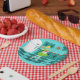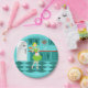 With these Retro Kitchen Paper Plates, you can have your pie and eat it, too. This kitschy, minimalist art drawing features a perfect 1950's housewife, in her mid century modern kitchen. The beautiful baker is wearing a flouncy, green dress and a white apron with red detailing. Not a hair on her blonde head is out of place. In one hand, she is holding the fruit of her labour--a gorgeous, lattice topped, fruit pie. One glance and you'll know that her flaky pie crusts are second to none. She is standing on an aqua and teal chequerboard floor, which is undoubtedly clean enough to eat off of. Against an aqua wall, we see teal cabinetry with aqua trim work, a red countertop, red drawer pulls, and black starburst accents. A red, starburst clock is hanging on the wall. To the side, there is a state of the art, white refrigerator with silver handles. At least, the fridge was state of the art in 1950's. Now, it's just plain dreamy! Whether you're Suzie Homemaker or simply have an affinity for all things vintage, you're sure to love this scrumptious slice of Americana.
