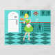 With this Retro Kitchen Postcard, you can have your pie and eat it, too. This kitschy, minimalist art drawing features a perfect 1950's housewife, in her mid century modern kitchen. The beautiful baker is wearing a flouncy, green dress and a white apron with red detailing. Not a hair on her blonde head is out of place. In one hand, she is holding the fruit of her labour--a gorgeous, lattice topped, fruit pie. One glance and you'll know that her flaky pie crusts are second to none. She is standing on an aqua and teal chequerboard floor, which is undoubtedly clean enough to eat off of. Against an aqua wall, we see teal cabinetry with aqua trim work, a red countertop, red drawer pulls, and black starburst accents. A red, starburst clock is hanging on the wall. To the side, there is a state of the art, white refrigerator with silver handles. At least, the fridge was state of the art in 1950's. Now, it's just plain dreamy! Whether you're Suzie Homemaker or simply have an affinity for all things vintage, you're sure to love this scrumptious slice of Americana.