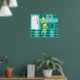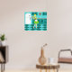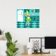 With this Retro Kitchen Poster, you can have your pie and eat it, too. This kitschy, minimalist art drawing features a perfect 1950's housewife, in her mid century modern kitchen. The beautiful baker is wearing a flouncy, green dress and a white apron with red detailing. Not a hair on her blonde head is out of place. In one hand, she is holding the fruit of her labour--a gorgeous, lattice topped, fruit pie. One glance and you'll know that her flaky pie crusts are second to none. She is standing on an aqua and teal chequerboard floor, which is undoubtedly clean enough to eat off of. Against an aqua wall, we see teal cabinetry with aqua trim work, a red countertop, red drawer pulls, and black starburst accents. A red, starburst clock is hanging on the wall. To the side, there is a state of the art, white refrigerator with silver handles. At least, the fridge was state of the art in 1950's. Now, it's just plain dreamy! Whether you're Suzie Homemaker or simply have an affinity for all things vintage, you're sure to love this scrumptious slice of Americana.
