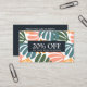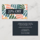 Retro botanical themed discount or coupon card featuring digital image of leaves in elegant warm earth palette of black, orange, pink, dusty blue and green over a white background. Black stripe overlay. Great for beauty, fashion , entertainment and event professionals.