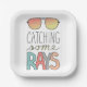 Fun hand illustrated and lettered plate featuring sunglasses and the phrase catching some rays. Great for a pool party, a barbeque or just a fun summer get together.