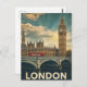 Send a slice of Great Britain with this retro-style postcard. It features a stunning, vintage-look illustration of London's most famous landmarks, including the iconic Big Ben, the Houses of Parliament, and a classic red double-decker bus crossing a bridge. This postcard is perfect for sharing your travel adventures or as a memento for anyone who loves London's timeless charm.