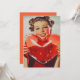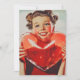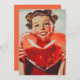 A nostalgic 1950s-inspired image of a smiling young woman holding a glowing, hollow, heart-shaped object. Her vibrant red attire and cheerful expression evoke warmth, joy, and timeless romance, capturing the vintage charm of the era.