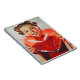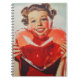A nostalgic 1950s-inspired image of a smiling young woman holding a glowing, hollow, heart-shaped object. Her vibrant red attire and cheerful expression evoke warmth, joy, and timeless romance, capturing the vintage charm of the era.
