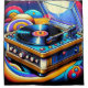 A colourful illustration of an old LP Record player floating in the sky on bubbles.