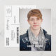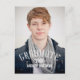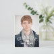 Modern Graduation Party Invitation Postcard for male graduates with a simple design with retro typography white text overlay. Elke Clarke © for MonogramGallery. Customise with your grad information by selecting "customise it" or use the template menu prompts. Exchange the sample photo for your own.