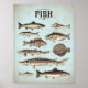 retro ocean poster with different fishes such as salmon, cat shark, trout, sturgeon, perch, turbot, herring, gurnard and grouper on a stained paper background. Marine design in the style of vintage encyclopedias - great for a beach home or kitchen.