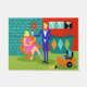 This Retro Martini Couple Door Mat looks like a scene out of a romantic comedy. The setting of this 1960's style, minimalist art design is an elegantly decorated, mid century modern house or apartment. The cast is an attractive couple enjoying an evening filled with sparkling conversation, good music and bottomless drinks. The room features a green floor, and an aqua and teal brick wall. Resting comfortably in a mod, orange egg chair is a beautiful woman. Her bright pink dress is just short enough to show off her shapely gams. With the wave of a hand, this blonde beauty has the immediate attention of her male admirer. Her fair haired companion is wearing a blue suit, white shirt and black bow tie. In his hands, he is holding two, crystal martini glasses with floating olives. Don't worry. He's offering one to his lady friend. The pair is having such a delightful time that neither is taking notice of the hour showing on the kitschy, red, starburst clock on the brick wall behind them. On a recessed fiery red wall, there are three Classic Movie Martini Stretched Canvas Prints, also available from StrangeLittleOnion's Zazzle store (hint, hint!) Two of the prints feature turquoise backgrounds and one is on a dramatic black background. Centred beneath the prints is an elegant wet bar. The front of the teal bar has three harlequin diamonds, in shades of orange, turquoise and green. We can see the silhouettes of martini glasses resting on the counter top. Across the room, an orange ottoman is holding a blue and black, portable record player. On the floor, we see the vinyl records and a bright yellow album cover. This attractive duo is having such a delightful time that neither is taking notice of the hour showing on the kitschy, red, starburst clock on the brick wall behind them.