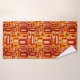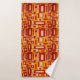 The Retro Mid Century Modern Geometrics bath towel set features a geometric pattern of rectangles and squares with a crackle texture. The colours are red, golden yellow, ochre and ivory.