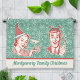 Celebrate Christmas in retro 1950s mid-century modern style with this pretty kitchen towel. The design includes a vintage-looking woman wearing a Santa hat and holding a martini glass, and a man wearing a reindeer antler hat and holding a champagne bottle. The background is teal with snowflakes. Use the easy template to personalise your name along the bottom edge of the towel. The design appears twice (on the front side of the towel), so it will show with either edge facing out when hung folded in half on a kitchen or bathroom towel rack. Enjoy the matching holiday invitations found here: https://www.zazzle.com/christmas_party_retro_midcentury_winter_xmas_humor_invitation-256399088616443134