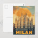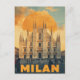 This stylish card features a vintage-style illustration of the iconic Milan Cathedral (Duomo di Milano). The design captures the grandeur of the gothic architecture, silhouetted against a bold, golden sun and a dramatic cloudy sky. The retro colour palette and chunky "MILAN" typography give it a fun, nostalgic travel poster feel. Perfect for a note from Italy or for anyone who loves travel and art.