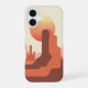Vintage illustration of a stylized desert butte (or mesa) featuring a simple circular sun, rendered in warm, terracotta tones.