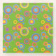 Bright and colourful throwback pattern features multi-ringed circles of a variety of sizes and colours on grass green background.